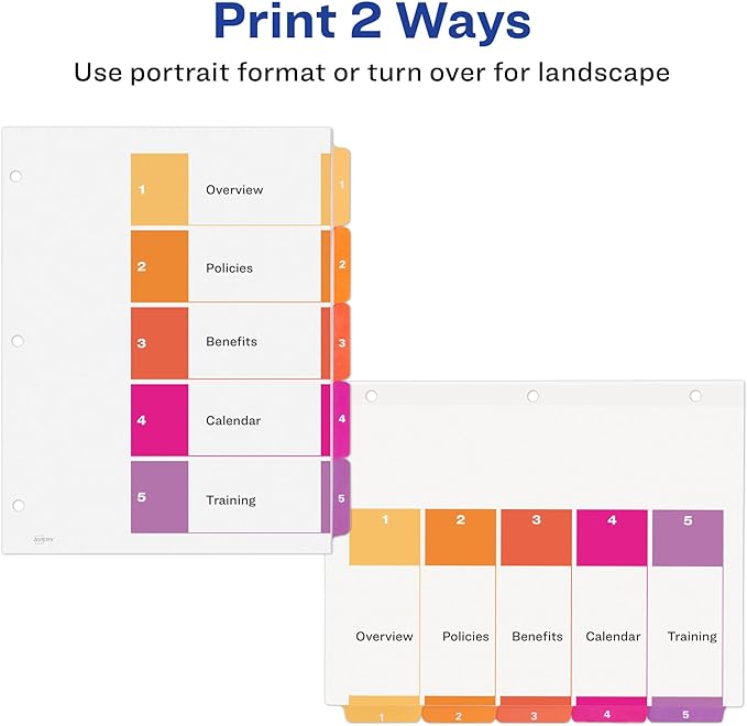 Avery 5 Tab Dividers for 3 Ring Binders, Customizable Table of Contents, Multicolor Tabs, 1 Set (11131)