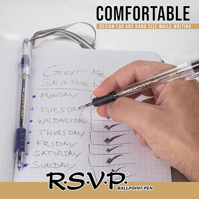 - R.S.V.P. pens feature maximum ergonomic comfort thanks to latex-free rubber grips that offer writing control. The permanent ink included in these cozy pens provides a smooth, reliably clean mark that is easily legible.