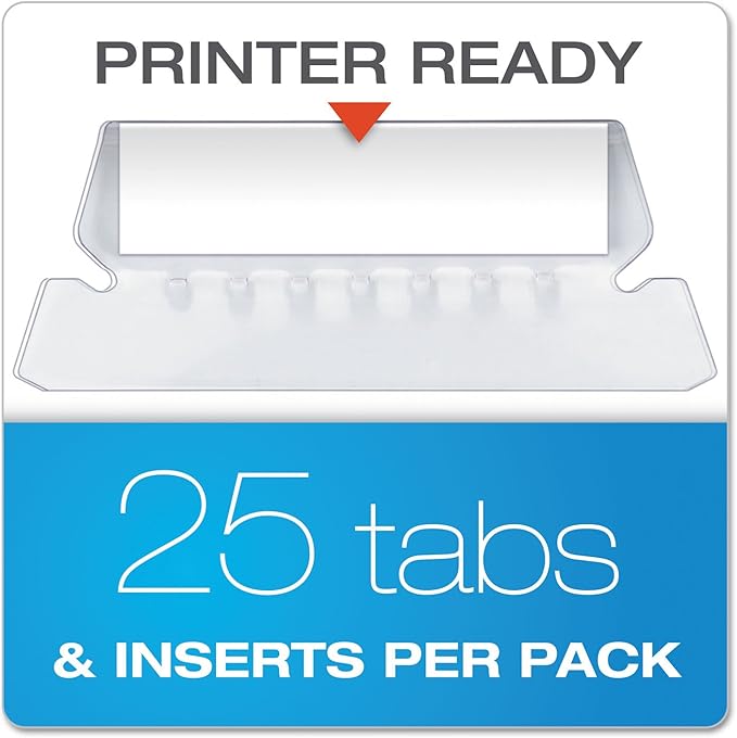 - Includes a printable label sheet and 25 clear 1/5-cut tabs