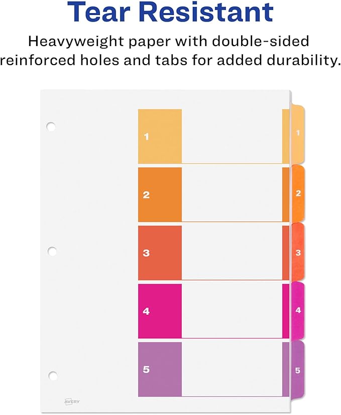 - 3 sets of 5 dividers are paper with durable hole and tab reinforcements on both sides