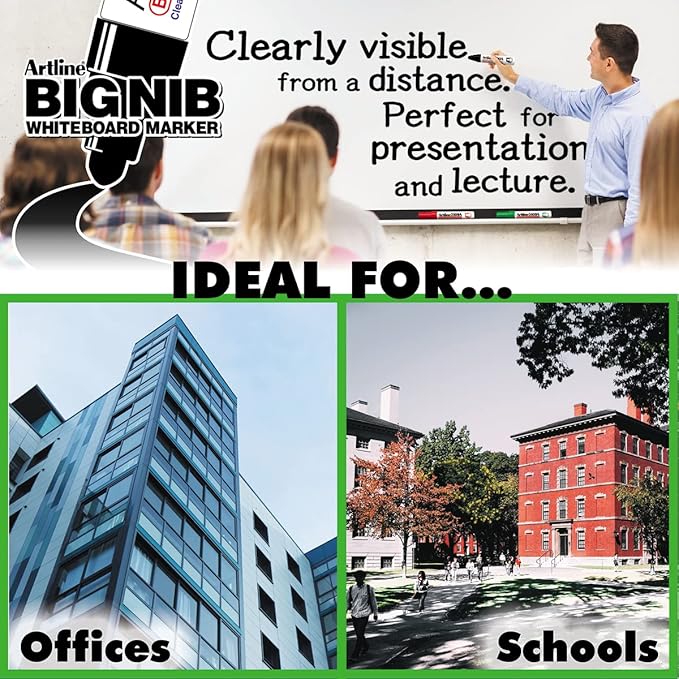 - Versatile Writing: Artline 5109A Extra Wide Magnum, true office and classroom must-haves, ensures clear visibility with its 10mm flat tip; Ideal for dry-erase boards, these markers come in a 4-pack featuring black, red, blue, and green
