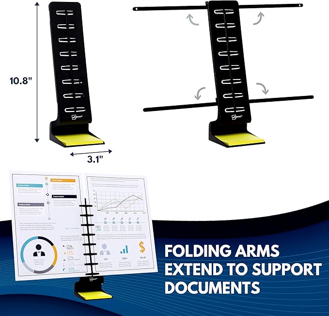 - Compact & Light Weight: The typing stand document holder features a compact tower design with flexible clips and lightweight folding arms, making it not only space-efficient but also easy to manage and adjust. Our sleek build does not clutter the desk and is ideal for any workspace, whether at home or in a professional setting