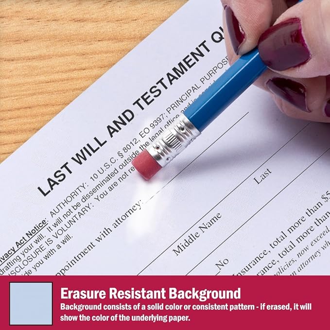 - Security paper features include: hidden message technology (“UNAUTHORIZED COPY” appears when copied) and a blue colored background that shows alterations when erased.