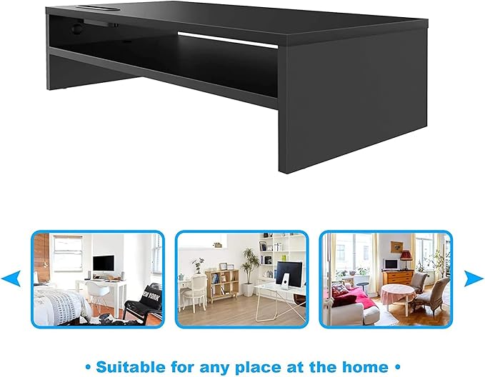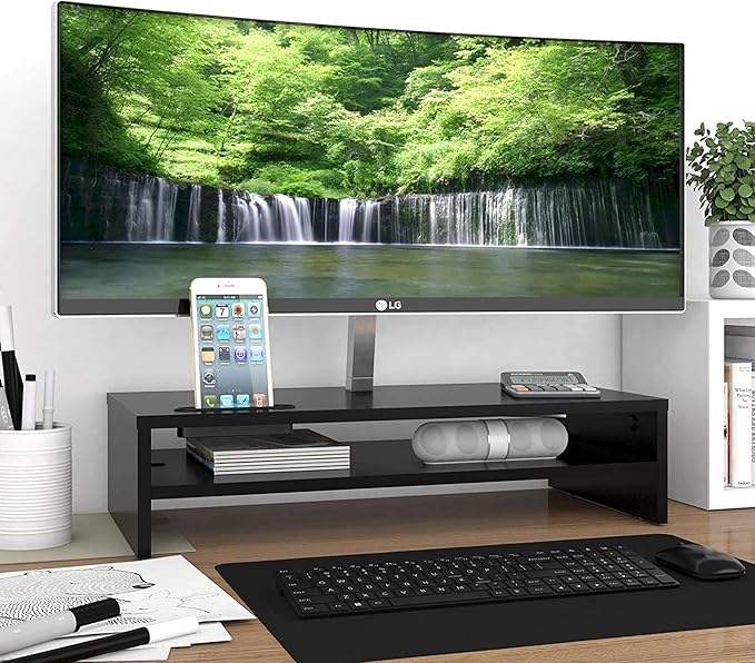 - 【MONITOR RISER STAND WITH STORAGE ORGANIZER】Our monitor stand rise comes with cable management slots that can make your cord stay organized. Cell phone holder will free your hands to make work easier. The monitor shelf provides enough area for storing laptops, keyboards, wireless mice, and daily necessities to keep your desktop tidy.