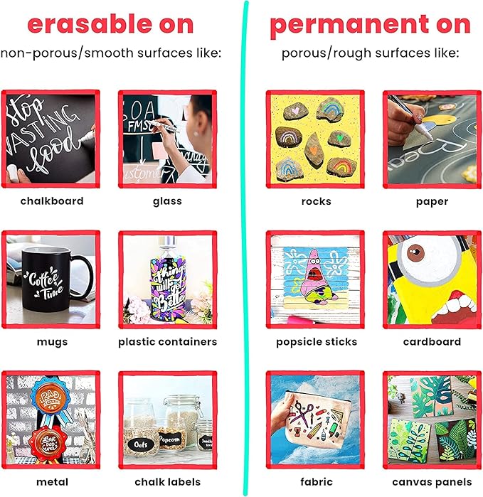 - Comes Off Easy - The white chalk marker will work on almost any surface! These chalk board markers are washable & will erase off on non-porous surfaces such as glass & mirrors (dry & wet erase) & permanent on porous surfaces (like wood)
