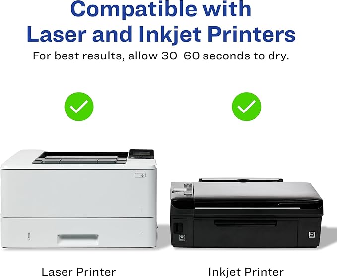 - Printable labels compatible with laser and inkjet printers; for best results, allow 30 to 60 seconds to dry