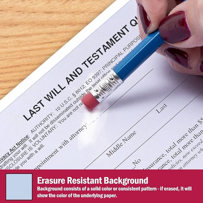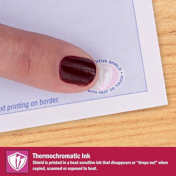 - Security paper features include: a printed artificial watermark; microtext printing which is only legible when magnified, but illegible when copied; hidden message technology (“UNAUTHORIZED COPY" appears when copied); a blue colored background that shows alterations when erased; coin reactive ink that turns black when rubbed with a coin; a shield that is printed with heat-sensitive ink and disappears when copied; and a security features listing on the front of the sheet for compliance purposes.