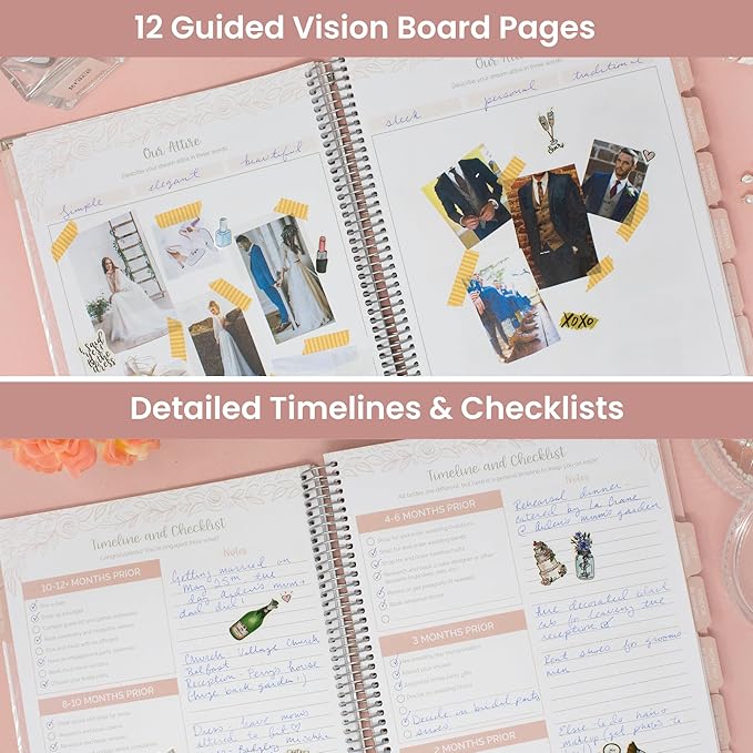 - Tabbed sections including "Our Visions," "The Basics," "Guest Planning," "Vendor Planning," "Monthly Planning," "The Big Day," and "Wedding Memories"