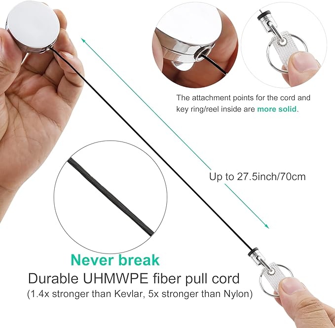 - Unbreakable Cord. Forget annoying cord breaks, the 27.5" UHMWPE fiber cord makes our retractable badge reel more flexible and stronger than steel wire. Unlocking doors has never been this easy.