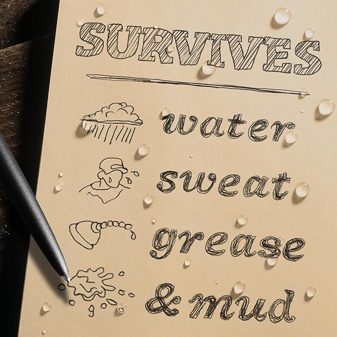 - WEATHERPROOF PAPER: 64 pages / 32 sheets per side spiral notepad. All-weather paper won’t turn to mush when wet and will repel water, sweat, grease, mud, and even survive the accidental laundry mishap. Make sure your pocket notebook stays RIGHT in the Rain.
