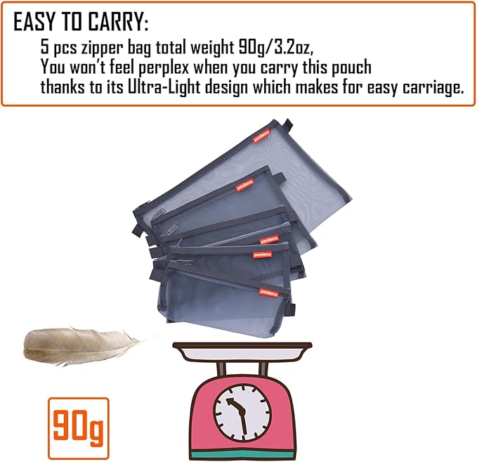 - EASY TO CARRY: 5 pcs mesh zipper bags total weight 90g, You won’t feel perplexed when you carry this pouch thanks to its Ultra-Light design which makes for easy carriage.