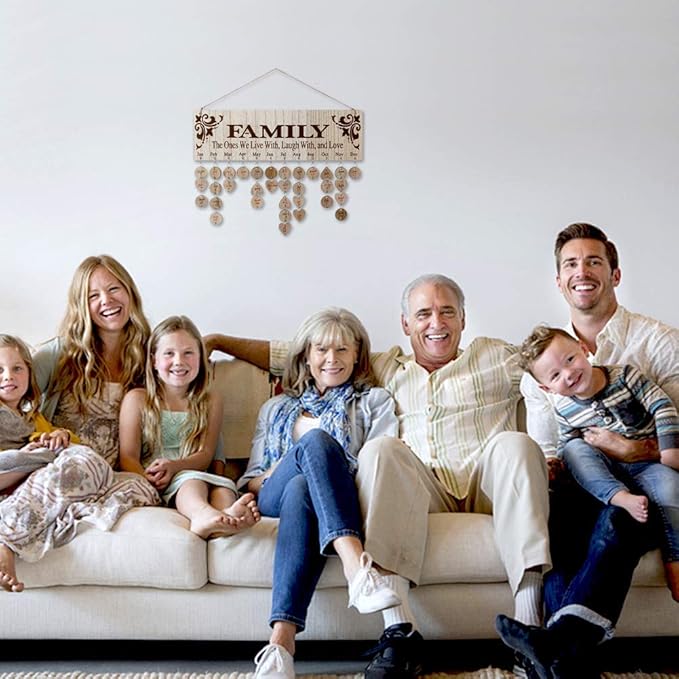 - 1. WHAT YOU GET AND DIMENSIONS: [PLEASE NOTE: Markers are not included. Words: Family The Ones We Live With, Laugh With, and Love. Laser Engraved. Not Printed.] 1x Family with Sayings Birthday Tracker Board Wall Hanging (15.7x4.7x0.2 inch), 50x Circle Wood Tags with Holes (Diameter 1.2 inch, Thickness 0.1 inch), 50x Heart Wood Tags with Holes (Diameter 1.2 inch, Thickness 0.1 inch), 100x Metal Jump Ring Fasteners (Diameter 0.5 inch), 1x Jute Twine String, 1x Adhesive Hook, 1x Gift Box.