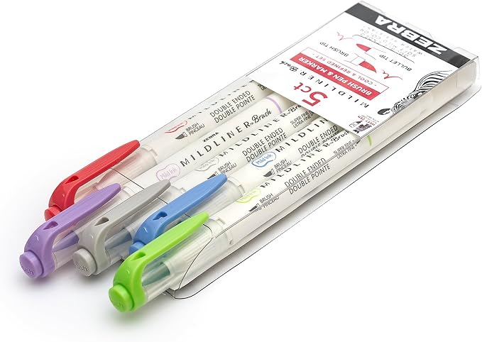 Zebra Pen Mildliner Brush Marker, Double Ended Brush and Fine Tip Pen, Assorted Cool and Refined Colors, 5 Pack