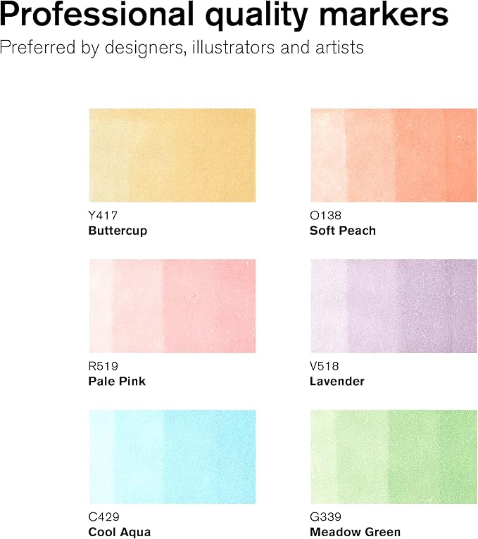 - Set contains Buttercup, Soft Peach, Pale Pink, Lavender, Cool Aqua, and Meadow Green.