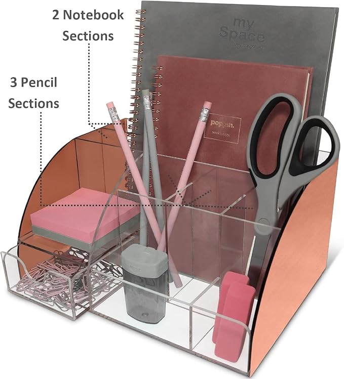 - DRESS UP YOUR DESK - Enhance your desk decor with this Rose Gold Acrylic Modern Desk Organizer, nicer then the classic wood desk organizers and accessories. Great addition to desk accessories for women, and men. Cute desk organizer for girls. Perfect for any desk accessories set. Show off your desk organization ideas. 100% SATISFACTION GUARANTEED