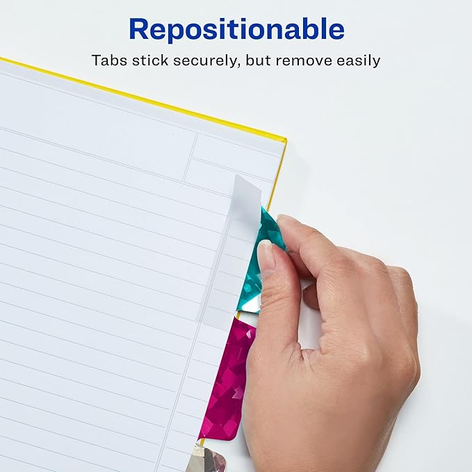 - Repositionable sticky tab adhesive keeps tabs secure and also removes cleanly to avoid residue and damage