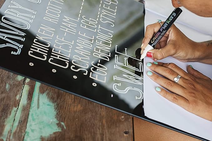 - ERASABLE on NON-POROUS SURFACES - Perfect for use on Non-porous chalkboards, menu boards, bistro boards, light boards, whiteboards, glass, metal, plastic, and more! Note, some chalkboards may not be suitable. We recommend testing on a small area first. These markers should not be used on chalk painted surfaces. Great for Bistro Boards, Menu Boards, Glass, Windows, White Boards, Classrooms, Mirrors, Non-Porous Chalk Boards, Plastic, Metal, and More!