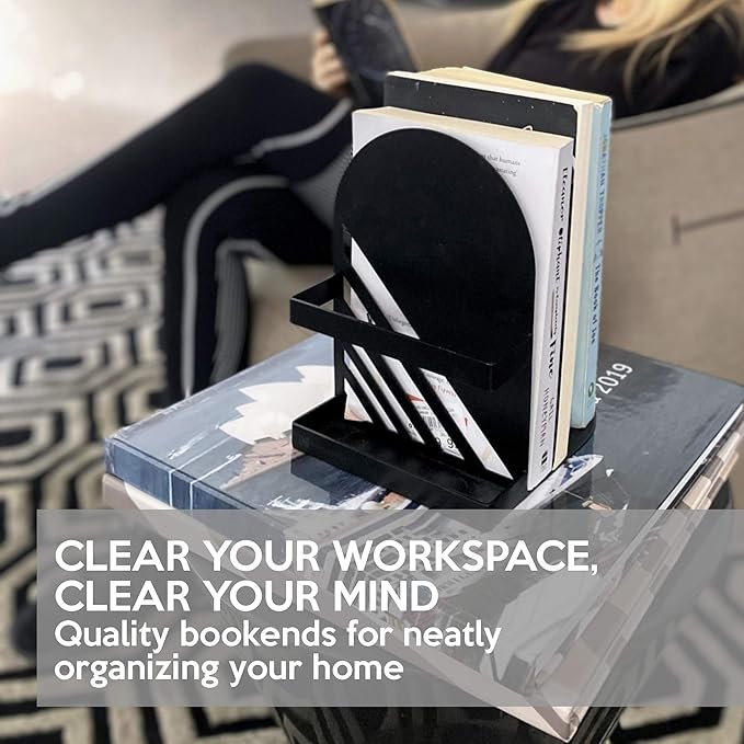 - EXTRA STORAGE CAPACITY: A highly unique design inspired by current trends of modern minimalism, our bold black book end features a built-in nook for the display of decorative accessories or storage of small office supplies.