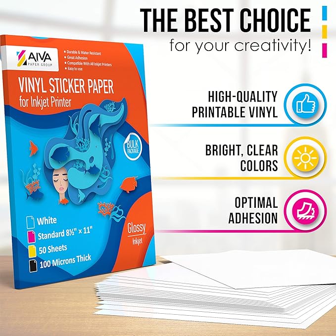 - High-Quality Printable Vinyl Paper - set includes 50 white vinyl sheets of Printable Sticker Paper for printer, Glossy finish. US Standard Letter Size - 8.5"x11". Suitable for High resolution and clear image quality