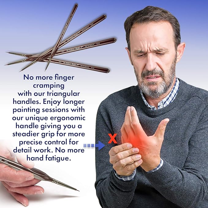 - Easy Grip Handle: Special triangular wood handle designed for a comfortable grip makes this easier to control for painting long hours thus reducing hand fatigue. The triangle grip also prevents your fine paint brushes for detail work from rolling off the table.