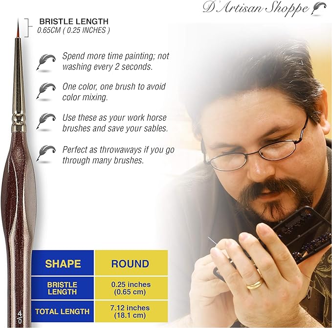 - Artist Grade Craftsmanship: High quality small paint brushes with durable synthetic nylon bristles and rust-proof brass ferrules. Individually hand crafted and double-crimped so no flaking paint from handles, loose bristles or ferrules with this pro mini paint brushes set. No compromise to the performance or appearance after multiple painting and cleaning. D'Artisan Shoppe stands by its product and will replace any faulty brushes so order these tiny paint brushes with total peace of mind.