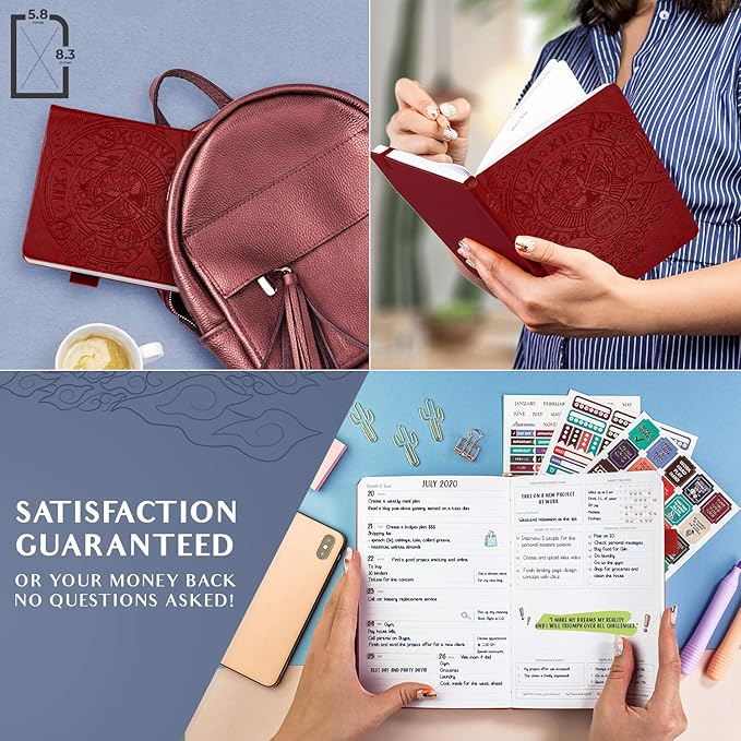 - A5 SIZE, STICKERS & USER GUIDE – This planner organizer comes in A5 size (5.8x8.3 inches), with an eco-leather hardcover, thick 120gsm paper, lay-flat binding, pen loop, elastic band, 3 bookmarks, pocket for notes, 3 sheets of stickers, and user guide.