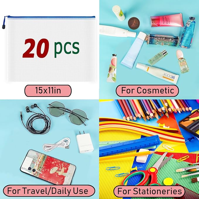AUSTARK 20 Pcs Zipper File Bags, Plastic Mesh Pouch, Board Game Storage Bag, Waterproof Bags for Office School (B4 Size 15''x11'', White and Blue)