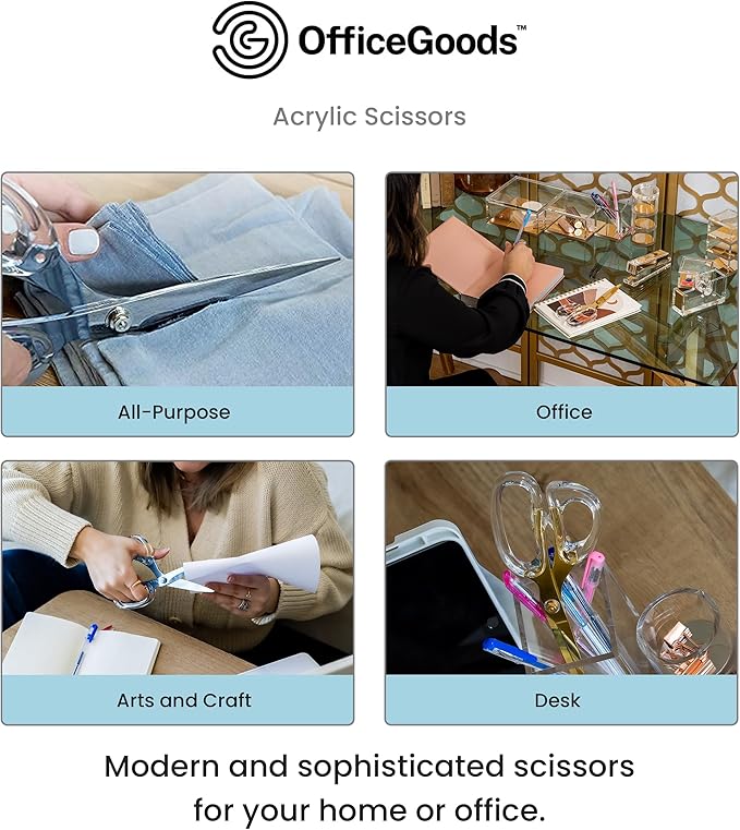 - Cut and craft with style - Cut in style with OfficeGoods Acrylic Scissors. Not just for arts and crafts, these sharp scissors for the office can also cut non-paper products, like ribbon, twine, and more.