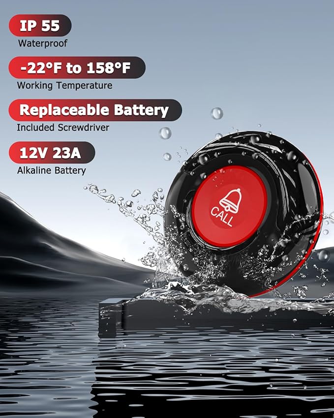 - EASY INSTALLATION AND OPERATION: Simple to set up and ready to use out of the box. The wireless call buttons can be easily installed with stickers or worn around the neck.
