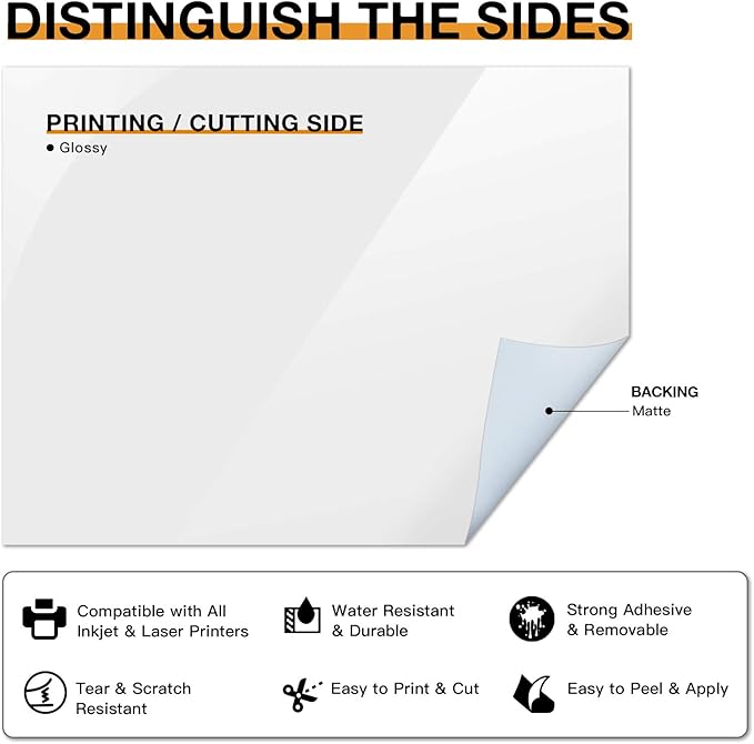 - INSPIRE UNLIMITED CREATIVITY: Our inkjet printable vinyl is a flexible and versatile material that can be used to make eye-catching signs and logos for business or customization. These sticker vinyl sheets will stick on any smooth & hard surfaces, plastic, glass, wood, and metal. Great for craft projects, Home Decor, Scrapbooking labels, including wall murals, decals for cars, print vinyl for laptops and phone labels, bumper stickers (not suitable for any soft surfaces such as T-shirts)