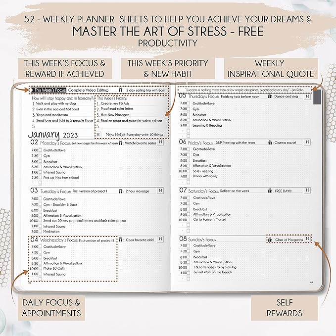 - LUXURIOUS + TOP QUALITY - Beautiful durable soft cover made from animal-friendly PU leather. Ideal for both women and men, perfect for entrepreneurs, professionals, college students and everyone who has burning desire to turn dreams into reality! FREE VIDEO MINI-COURSE: You will learn 10-min morning routine used by the most successful people to 10-fold your productivity, focus, happiness & passion! You will master setting goals & fix procrastination!