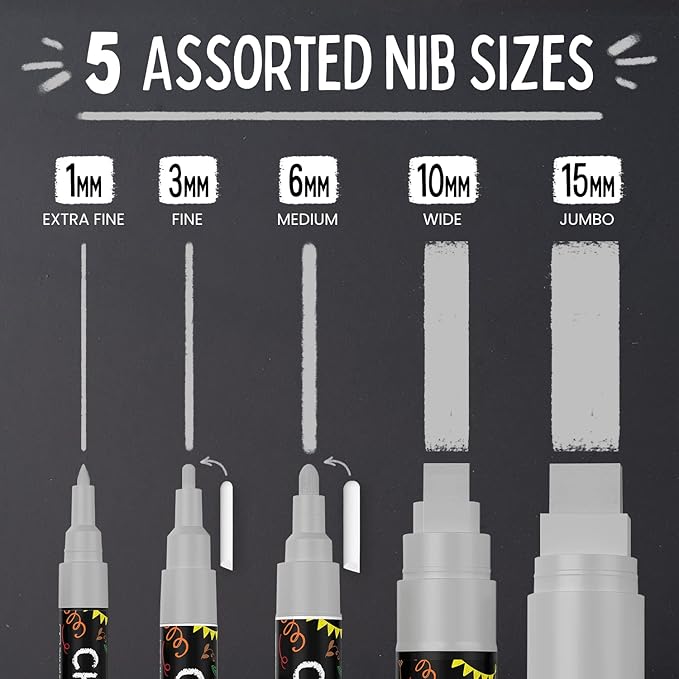 5 Silver Chalkboard Chalk Markers - Silver Dry Erase Markers for Blackboard, Chalkboard Signs, Windows, Glass | Variety Pack - Fine & Jumbo Size Ink Pen (1mm, 3mm, 6mm, 10mm, 15mm)