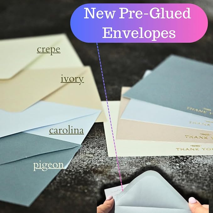 - PREMIUM SET WITH THOUGHTFUL DETAILS - Includes textured thick cards, embossed leaf envelopes, and large gold foil stickers, creating a polished and complete package. Set includes 9 pigeon, 9 carolina , 9 ivory, 9 crepe color cards and 36 pre-glued envelopes, 36 thank you sticker. Cards measure 4 inch x 6 inch.