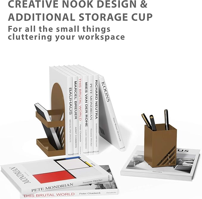 - BONUS PEN/PENCIL HOLDER: As a gift from us to you, our sahara gold metal bookends come with a bonus accessory you'll find useful. Use the matching container as a pen cup, pencil holder, succulent gold planter or desktop catchall.