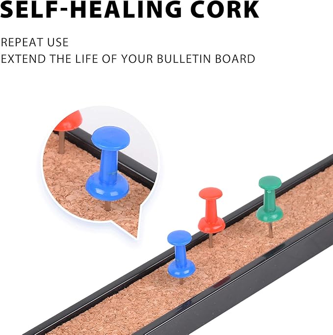 - SELF-HEALING CORK – Durable, self-healing cork helps extend the life of your board Holes will re-close when push pins are removed, which helps prevent crumbling over time