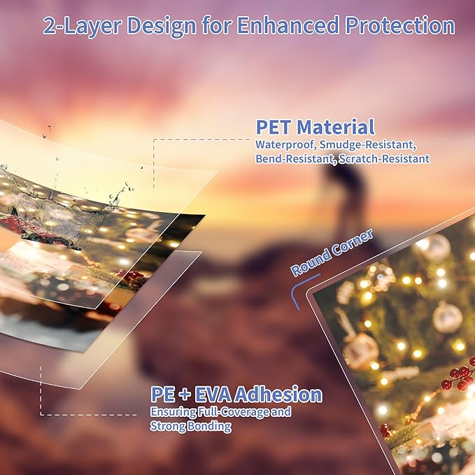 - 【Sturdy Material】 These thermal laminating pouches feature a 2-layer PET and EVA construction with PE integration in the EVA layer. This design provides reliable protection against water, smudges, bends, and scratches. The PE-enhanced EVA adhesive ensures a strong and lasting seal, preventing delamination even with frequent use. The robust structure resists breakage, while rounded corners offer a comfortable grip and reduce the risk of hand injuries, making them ideal for regular handling and storage.