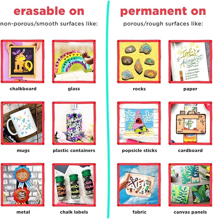 - Comes off Easy - The chalkboard pens will erase off non-porous surfaces; such as blackboard (wet erase), glass, mirror (dry erase) and are permanent on porous surfaces. These chalkboard paint markers can be used as window markers for cars, blackboard markers, window paint markers, glass paint markers.