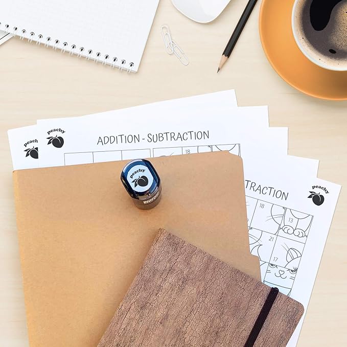 - Includes: One 9/16" round self-inking peach stamp. Black ink. Stamp incorporates the word "peachy" above a cute illustrated peach.