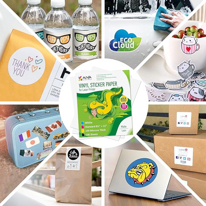 - Bulk Package of 100 sheets Printable Vinyl Sticker Paper for Laser printer - Matte finish - 8.5"x11"