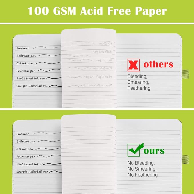 - Fountain Pen Paper: No Bleeding through for most ink pen is our paper's rigorous standard. After hundreds of test, we apply upgraded 100 GSM off-white Acid Free Paper, which helps write smoothly without ghosting, smearing and avoid eyes tiredness.