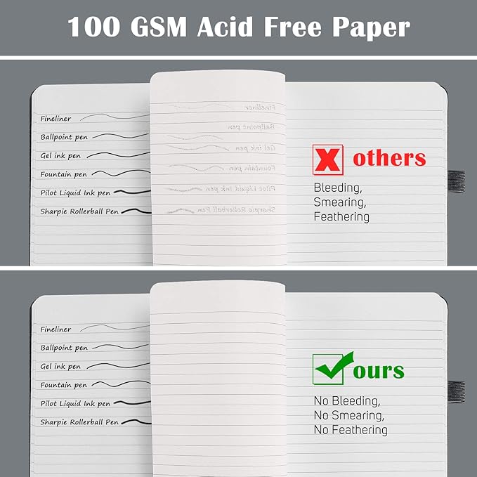 - Fountain Pen Paper: No Bleeding through for most ink pen is our paper's rigorous standard. After hundreds of test, we apply upgraded 100 GSM off-white Acid Free Paper, which helps write smoothly without ghosting, smearing and avoid eyes tiredness.