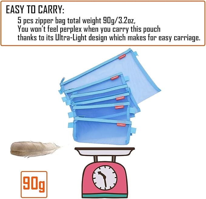- EASY TO CARRY: 5 pcs mesh zipper bags total weight 90g, You won’t feel perplexed when you carry this pouch thanks to its Ultra-Light design which makes for easy carriage.