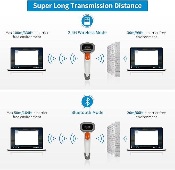 - ▲Auto Scanning & Storage Mode - Manual Scan & Auto-sensing Scan & Continuous Scan. Two working mode: Instant upload mode / storage mode. Scan and store barcodes, then update the data to your device when you come back entering the wireless transmission range. Sometimes the self-sensing scanning function is in the inactive stage, please contact us and be at your service at any time.