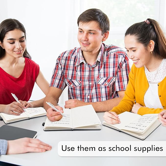 - Feela 5 Pack Classic Ruled Notebooks contains 5 classic gray ruled sturdy cover notebooks and 5 Black Retractable Pens. Each of the notebooks measures 8.3” x 5.1”, which is perfect to carry and easily held by young girls and boys. These black cute pens are customized to be placed in the pen holder, which is pretty convenient.