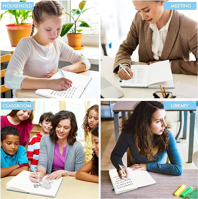 - Feela 5 Pack Classic Ruled Notebooks contains 5 classic light blue ruled sturdy cover notebooks and 5 Black Retractable Pens. Each of the notebooks measures 8.3” x 5.1”, which is perfect to carry and easily held by young girls and boys. These black cute pens are customized to be placed in the pen holder, which is pretty convenient.