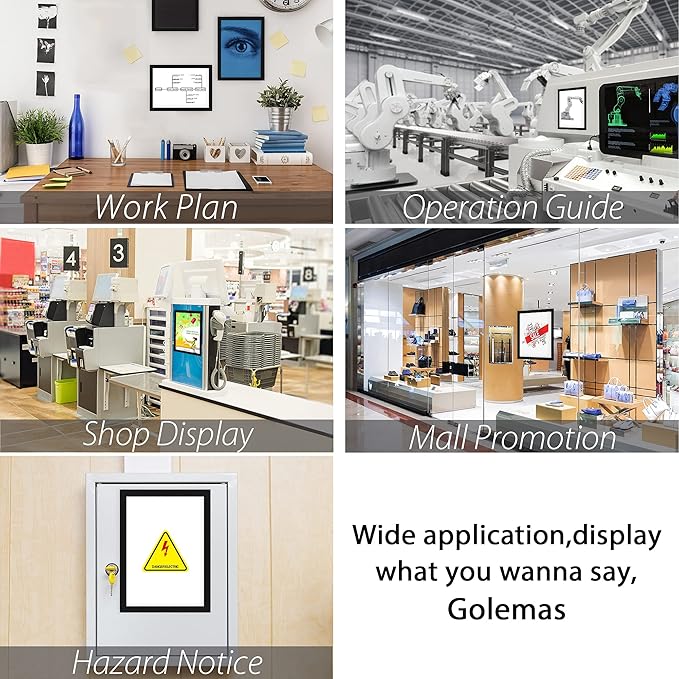 - 【Multi-Use Frame】 Golemas Magnetic Display Frame is a great tool to display signs in store, restaurant, school, office, factory, bank, hotel and so on. Meanwhile it's a great choice to use it at home to present photographs and artworks on a refrigerator or cabinet.
