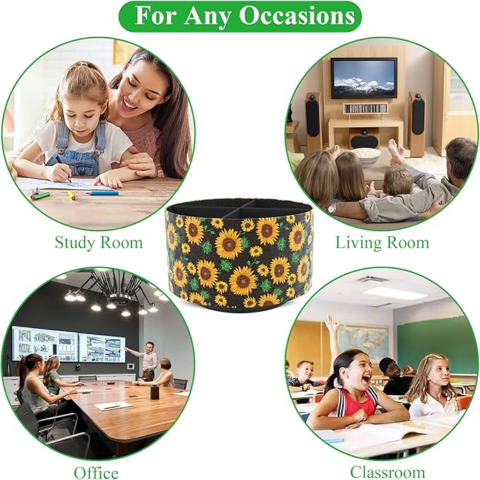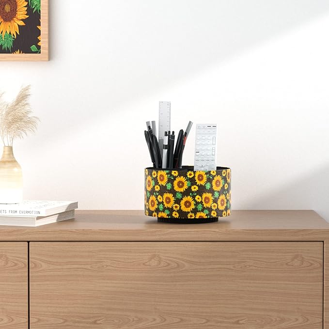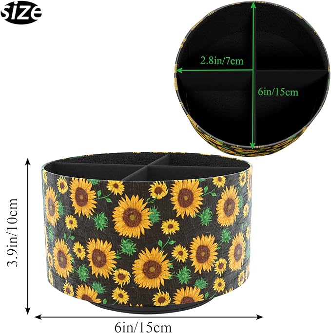 Hennaja Round Leather Art Supply Organizer,Remote Control Holder,360 Degree Rotating,Multi-Functional Pencil Holder,4 Compartments Desktop Stationary Organizer(1-Sunflower)