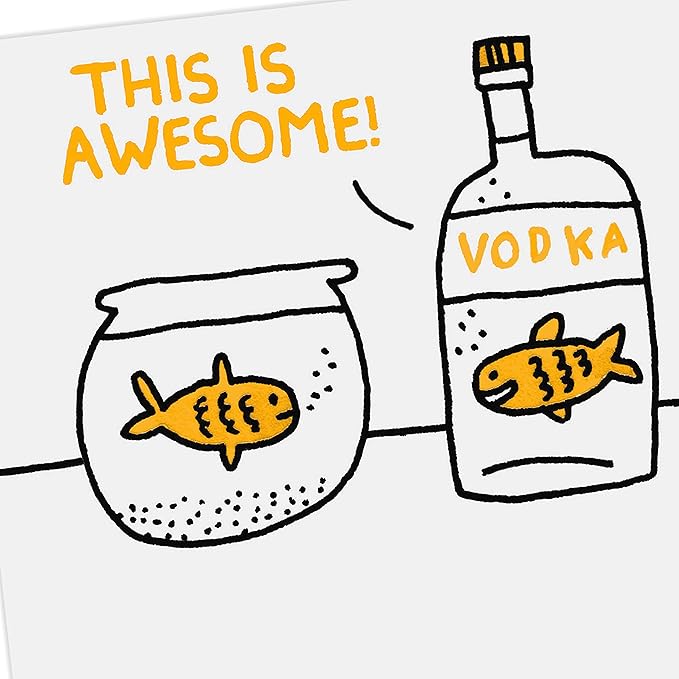 - Second card features a goldfish in a vodka bottle saying to a goldfish in a fish bowl, "This is awesome!" Inside reads: "Here's to spending your birthday in good spirits."