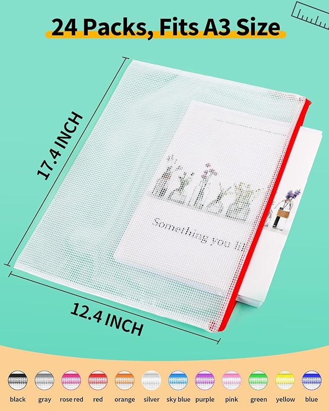 Smarpau Large A3 Mesh Zipper Pouch, 24 Pack 12 Colors 17.4" x 12.4" Zipper Pouches for Organizing, Multipurpose Waterproof Zipper Bags for Office Supplies