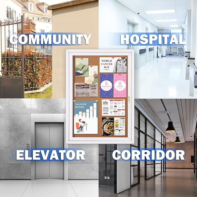 - 💧OUTDOOR USE —The weather-resistant cabinet construction features an aluminum frame with a smooth surface and full-length piano hinges that add strength and durability to the door frame. Drain holes on the bottom and a sealed backing mean you can mount the board outdoors.